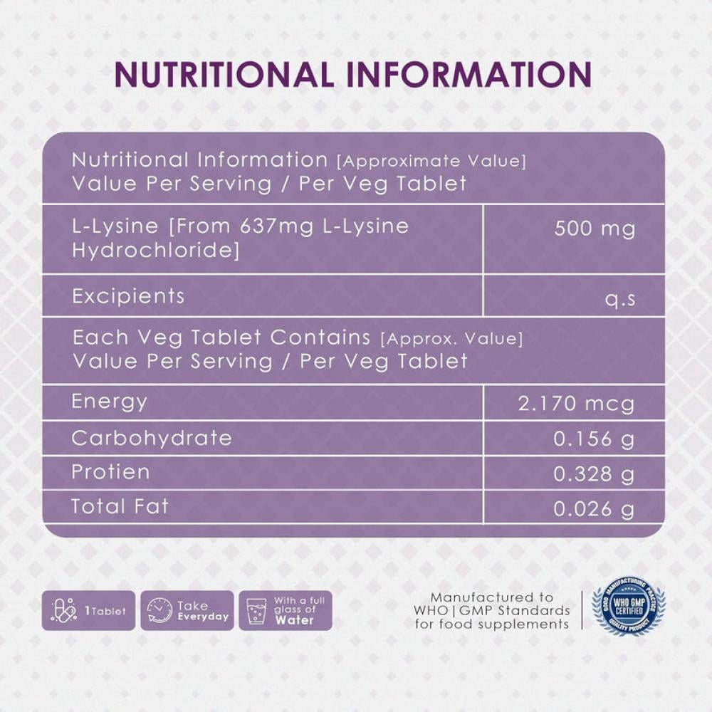 امنح جسمك ما يحتاجه من حمض الليسين الأساسي الذي لا يستطيع إنتاجه ذاتيًا. تركيبة نباتية نقية تدعم المناعة، تعزز إنتاج الكولاجين، وتحسّن امتصاص الكالسيوم وصحة الجهاز الهضمي.