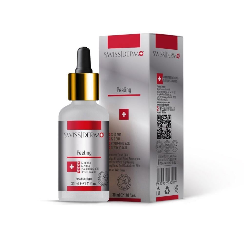 استعيدي إشراقة بشرتك مع سيروم سويس ديرمو للتقشير، المصمم خصيصًا لإزالة الخلايا الميتة بلطف وتجديد البشرة بفعالية، ليمنحك مظهرًا ناعمًا ومشرقًا.