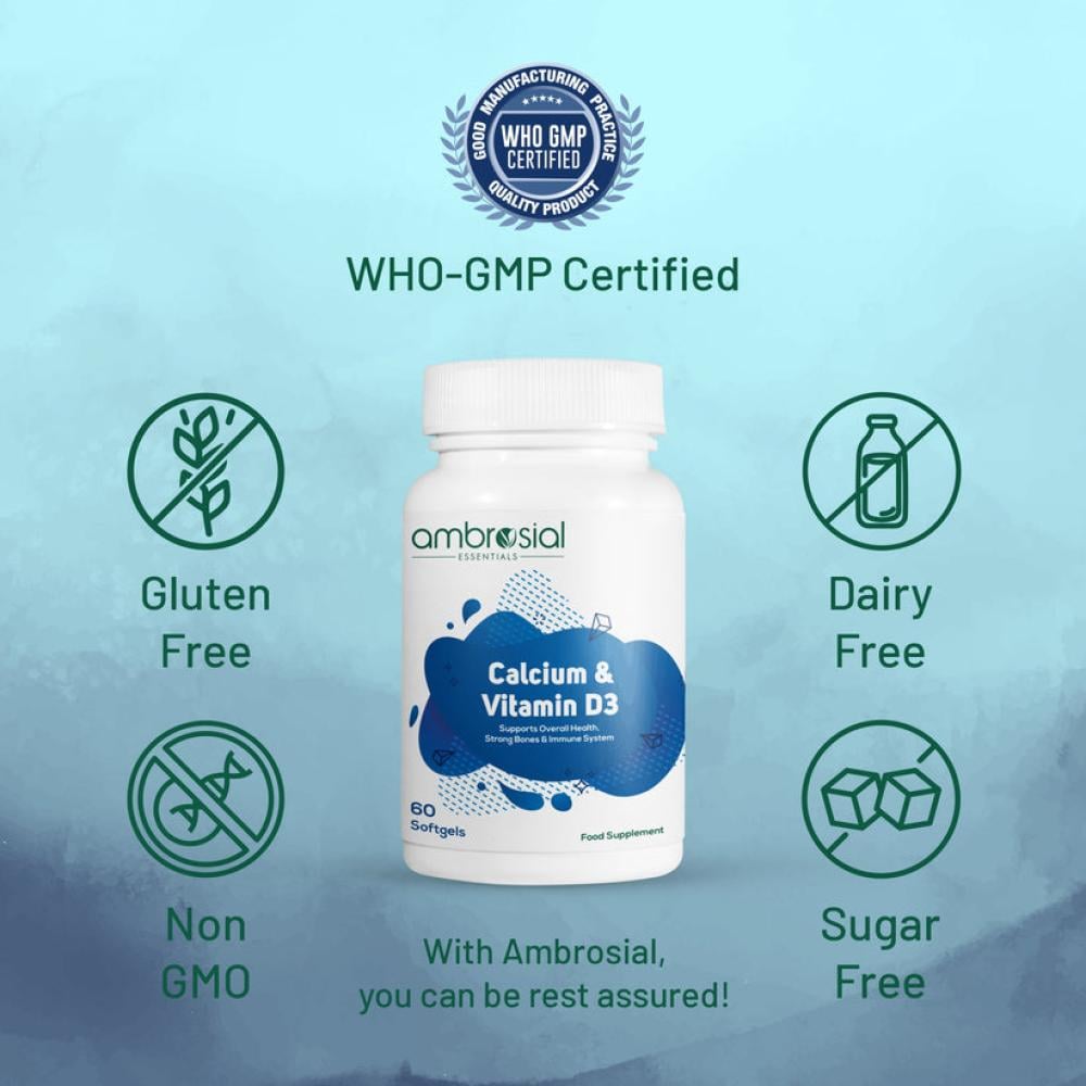 Ambrosial Calcium & Vitamin D3 هو مكمل غذائي متكامل يجمع بين الكالسيوم الضروري لبناء العظام، وفيتامين D3 الذي يعزز امتصاصه ويوصله بكفاءة إلى الهيكل العظمي.