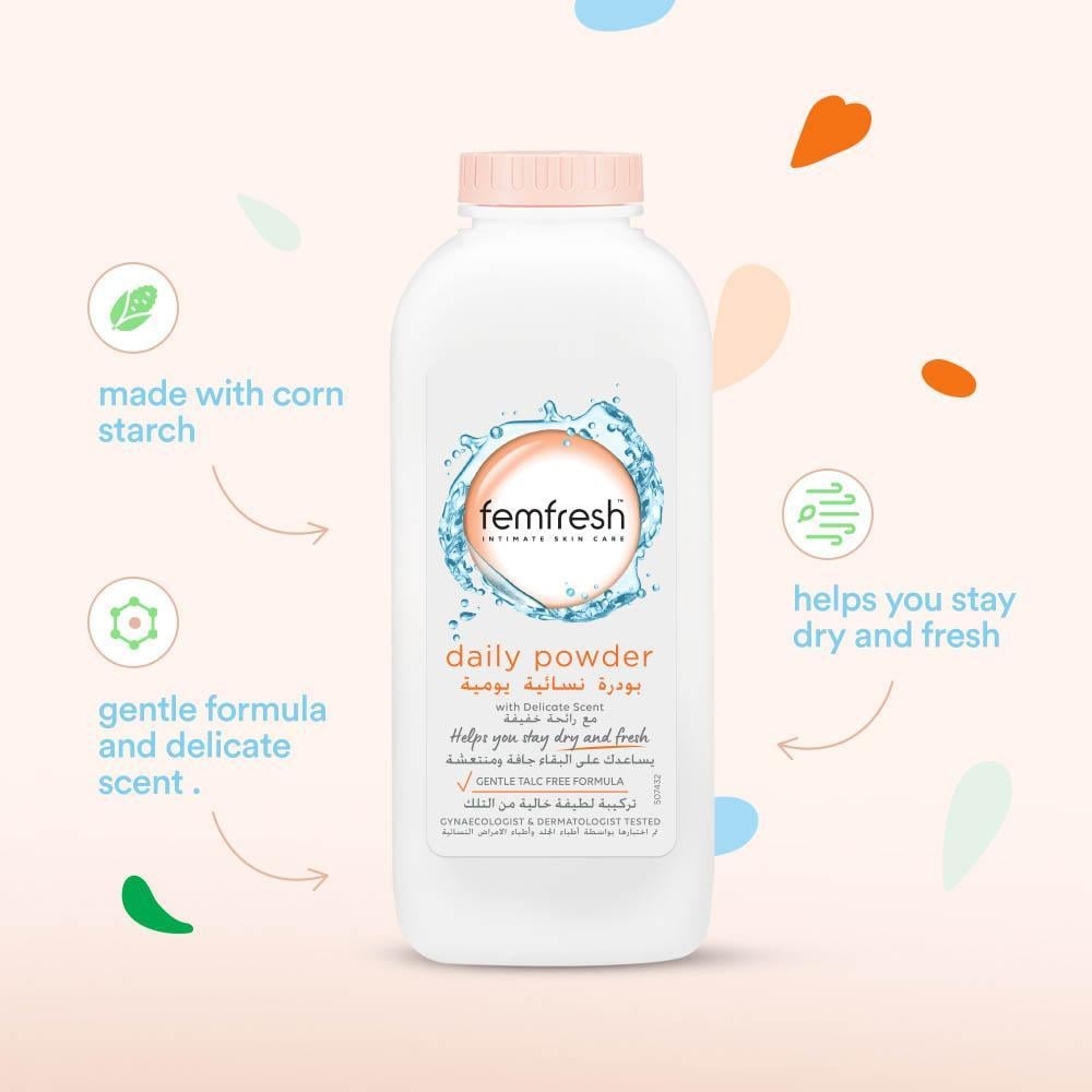 اشعري بالانتعاش والثقة طوال اليوم مع بودرة فيم فريش المصممة خصيصًا للعناية بالمنطقة الحميمة. تركيبة لطيفة بخلاصة الزهور الطبيعية تساعد على امتصاص الرطوبة الزائدة، وتمنحك إحساسًا بالنظافة والراحة يدوم لساعات.