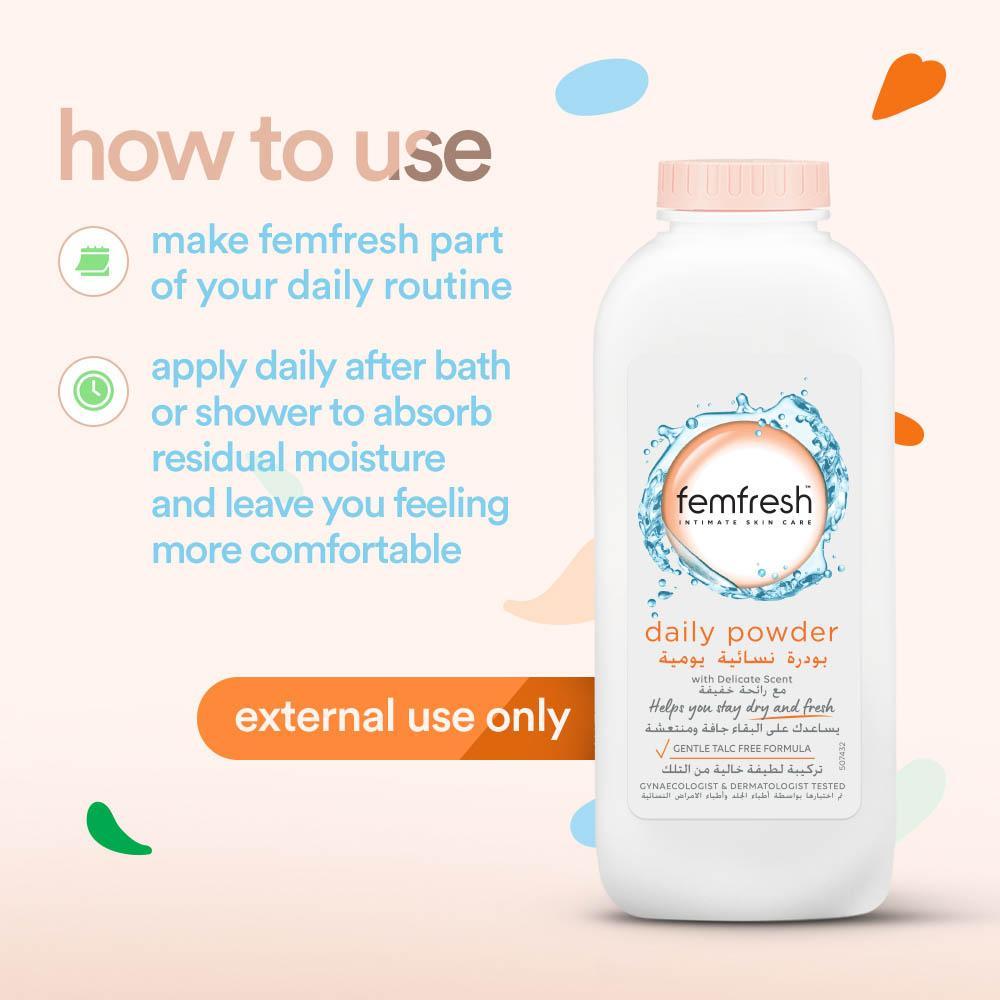 ضعي كمية صغيرة من البودرة على البشرة النظيفة والجافة في المنطقة الحميمة، ووزّعيها بلطف. يمكن استخدامها بعد الاستحمام أو في أي وقت تحتاجين فيه إلى انتعاش إضافي.