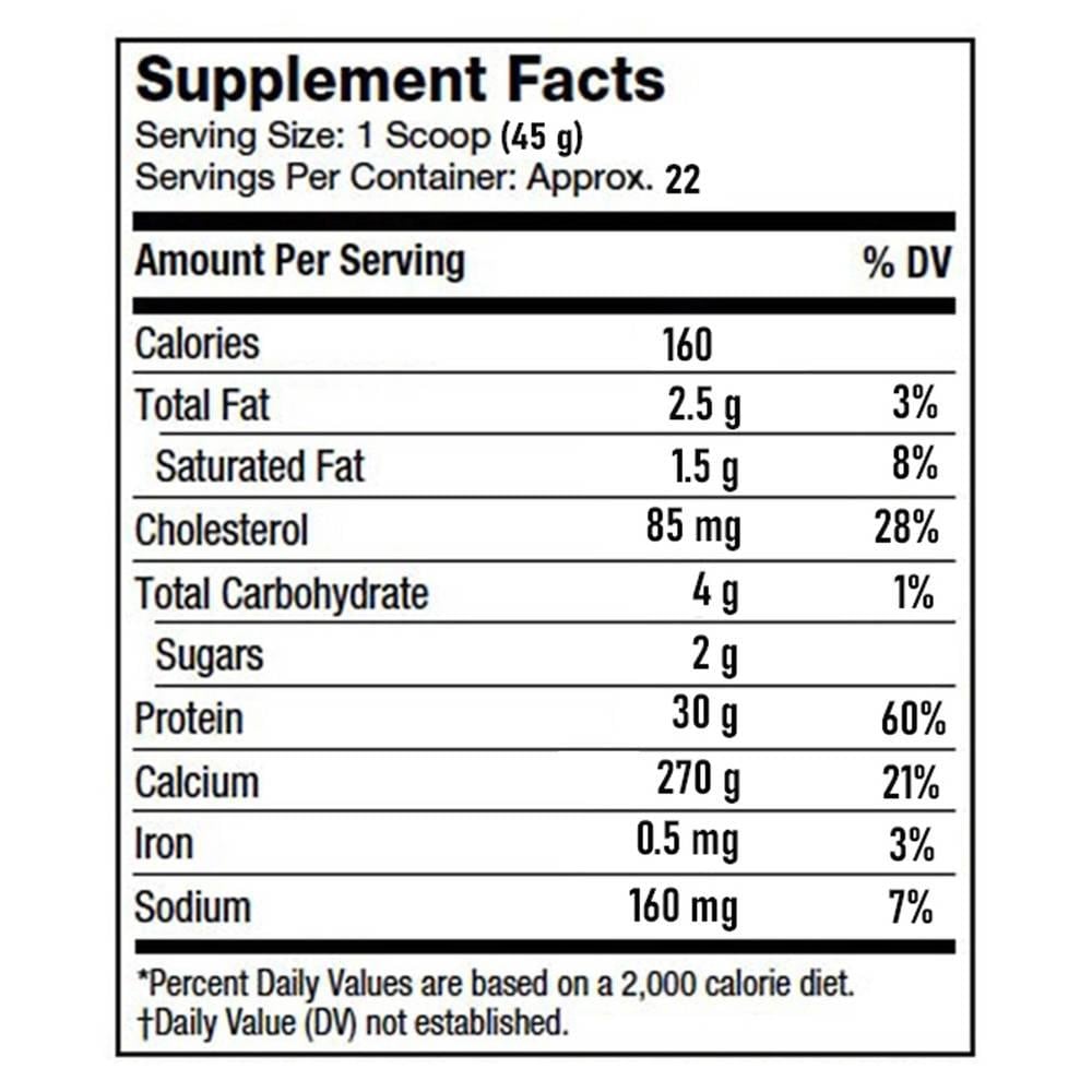 كل مكيال يحتوي على 30 غرامًا من البروتين المركز، 4 غرامات من الكربوهيدرات، و2.5 غرام من الدهون (قد تختلف الكميات بحسب النكهة).