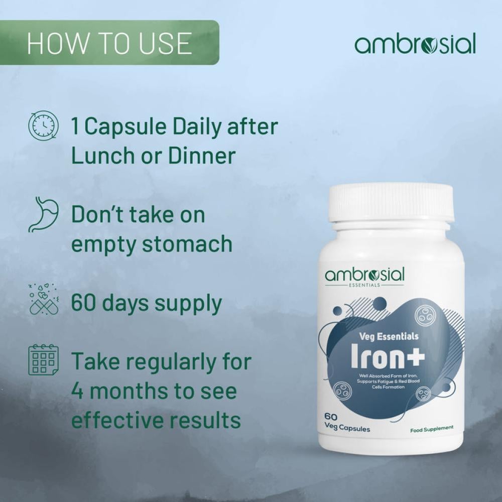 Ambrosial Iron+ 25mg هو مكمل غذائي نباتي مصمم خصيصًا لدعم مستويات الهيموغلوبين وتحسين الأداء البدني والذهني.